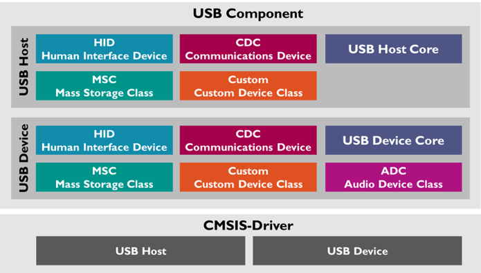 MDK 中間件組件嵌入式系統提供了USB主機設備和從機設備的支持。USB從機接口使用標準的設備驅動系列,對調試解調器是可以識別的,主機驅動的開發是不需要的。USB組件支持ADC,CDC,HID.MSC和自定義類的USB。