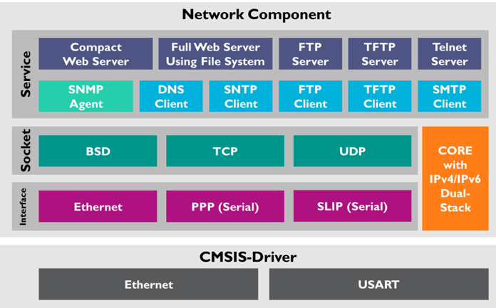 網絡組件是針對ARM Cortex-M處理器適當優化的全功能網絡組件,支持IPv4和IPv6(IPv6只在MDK專業版支持)。它代碼小并提供好的性能,該組件為例如TCP/UDP等傳輸協議提供了全面的支持,以及服務器和客戶端級別的應用程序,例如HTTP,Telnet,SMTP,SNMP,FTP。提供現代網絡所需的功能。