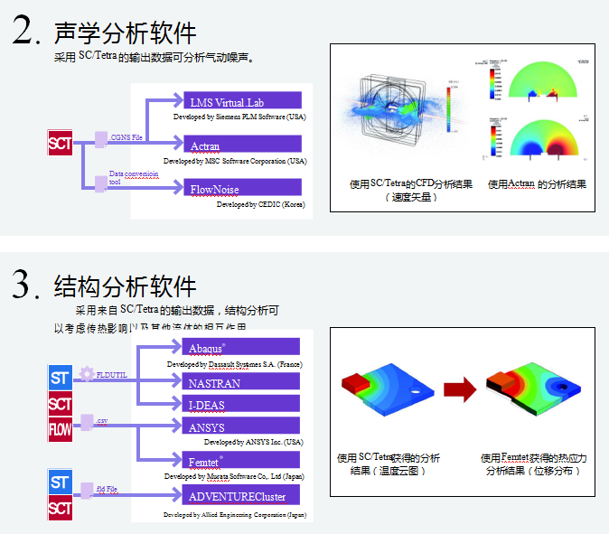 Software Cradle 提供了兩種不同類型的熱流分析工具: 采用結構化網格的 scSTREAM 和 HeatDesigner,以及采用非結構化網格的 SC/Tetra 和 scFLOW。