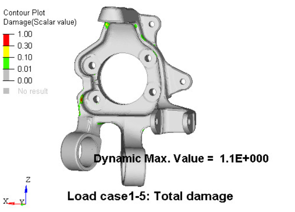 · 基于應力疲勞耐久分析 以轎車轉向節為研究對象,通過使用軟件Ansys nCode designlife的應力疲勞分析功能,分析了其在特定載荷下的損傷分布。