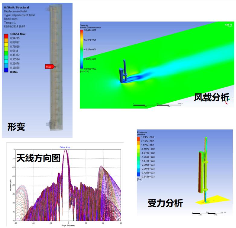 · 基站天線系統(tǒng)多物理場仿真 以基站天線為研究對象,使用軟件ANSYS HFSS,將經(jīng)過優(yōu)化的天線模型導(dǎo)入workbench平臺,利用CFX分析天線周圍風(fēng)速、風(fēng)洞內(nèi)氣流行為、湍流檢測等,將風(fēng)壓導(dǎo)入Mechanical計算基站天線是否發(fā)生形變,從而獲得基站天線全方位的性能分析。