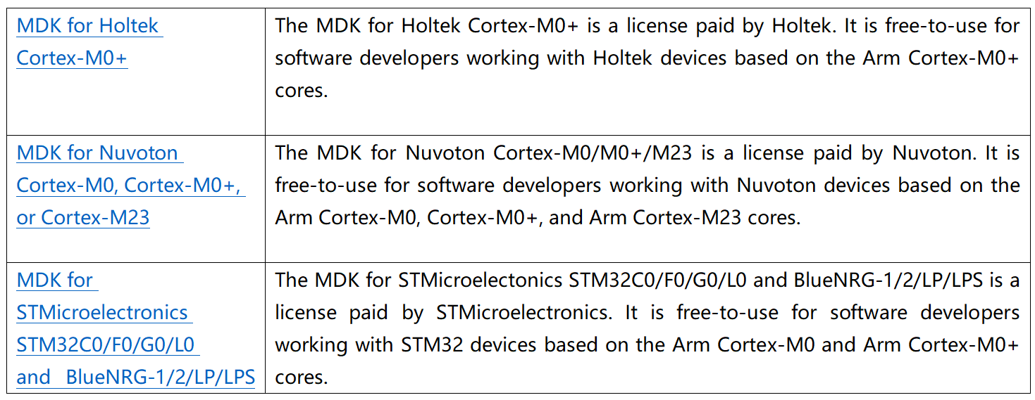 1 ?MDK 免費授權: 合泰、新唐、意法半導體的 M0 和 M0+架構的芯片。