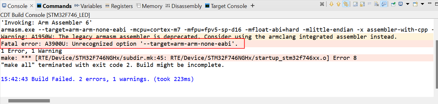 在用ArmDS進(jìn)行Coretex-M核開發(fā)項(xiàng)目時(shí),編譯工程時(shí),出現(xiàn)“--target=arm-arm-none-eabi”無法識(shí)別的問題,如圖2-1所示: