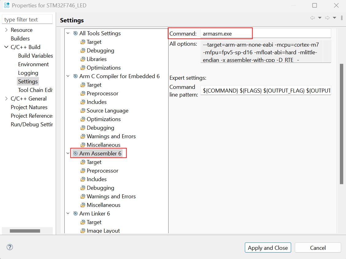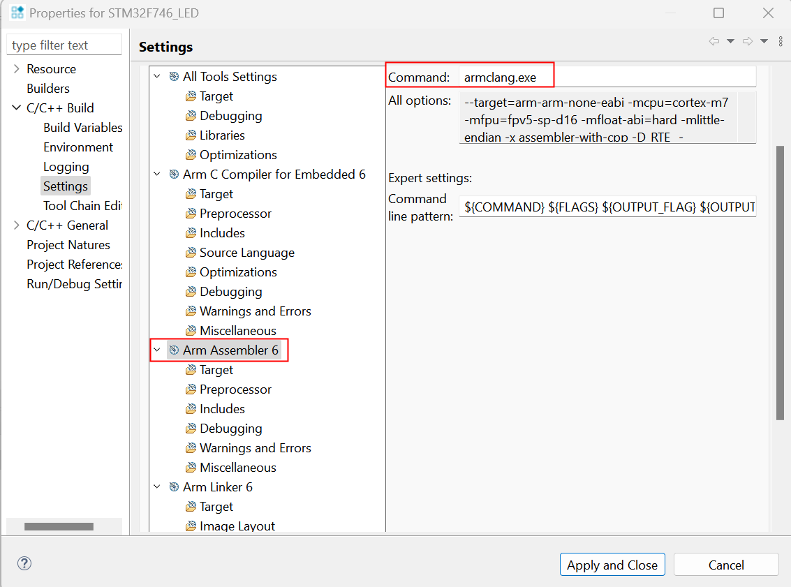 1)、打開工程的工程屬性窗體,把匯編器“armasm.exe”用“armclang”替換,如圖4-1所示: