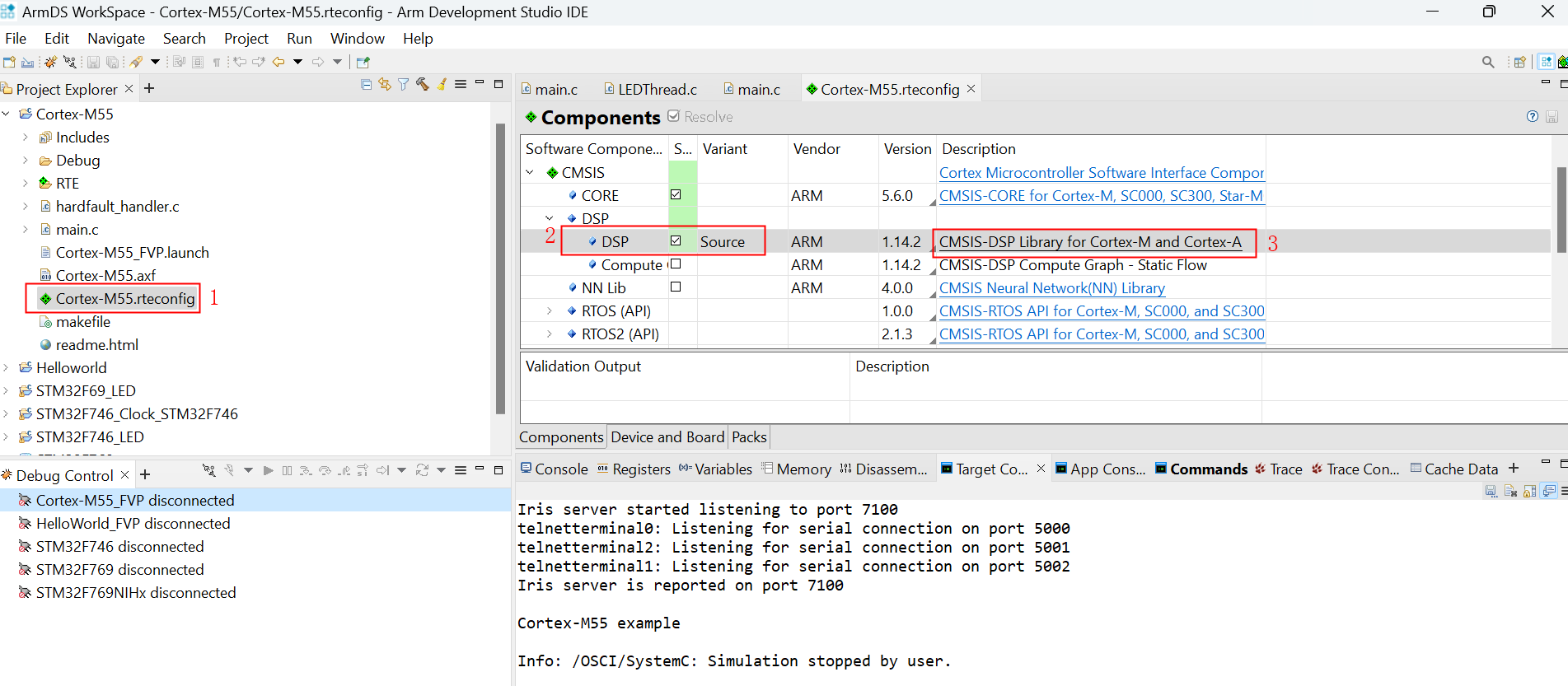 1)、打開(kāi)ArmDS軟件自帶的Coretex-M55的實(shí)例中的“Coretex-M55.rteconfig”文件,選擇“DSP”如圖4-1所示: