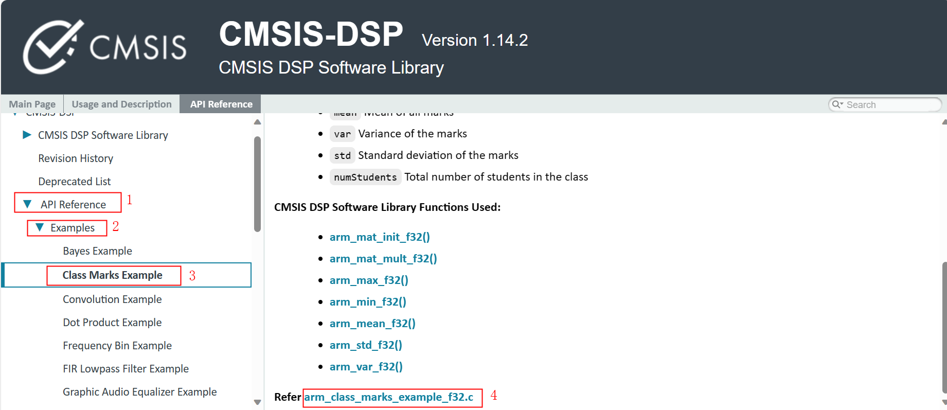 2)、在上圖中,點(diǎn)擊“CMSIS-DSP Library for Cortex-M and Comtex-A”,打開(kāi)幫助文檔,找到“arm_class_marks_example_f32.c”文件,如圖4-2所示: