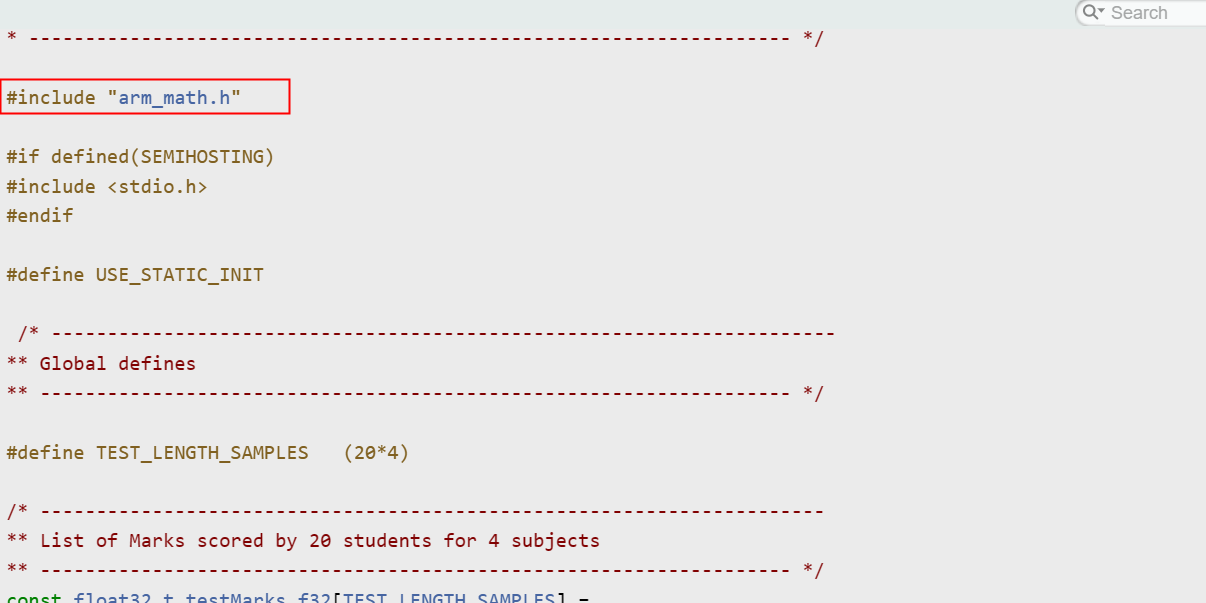 3)、打開(kāi)“arm_class_marks_example_f32.c”文件,把CMSIS-DSP庫(kù)的相關(guān)的API添加到工程的main.c中,然后編譯工程,如圖4-3所示:(注:arm_math.h是CMSIS-DSP庫(kù)的頭文件)