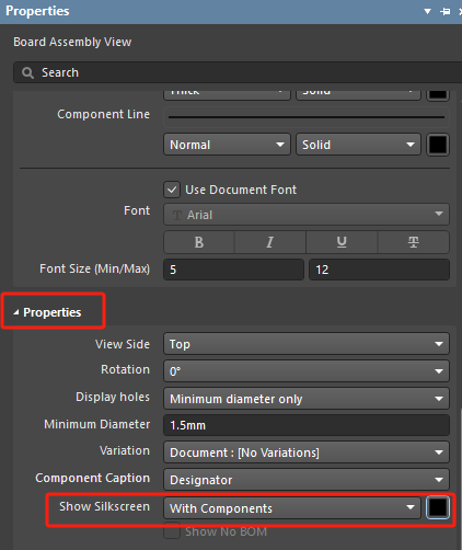 2、Drafsman 文檔中選中圖形在 Propertise 的 Show Silkscreen 選擇"With component"選項(xiàng),并在后面的顏色框中設(shè)置顏色為黑色。