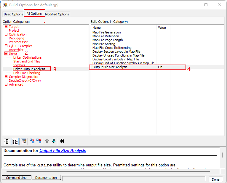 (2)、切換到All Options欄,找到Linker選項,然后找到Linker Output Analysis配置項中的Output File Size Analysis選項(如圖2)或者通過搜索功能,搜索找到Output File Size Analysis選項(如圖4-1-2)。