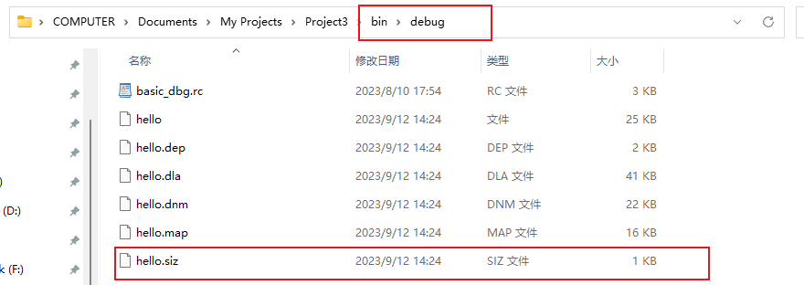 (4)、設(shè)置好后,每次編譯完成就可以在工程下的bindebug目錄下面找到生成的文件擴(kuò)展名為“.siz”的Size文件。(如圖4-1-4)