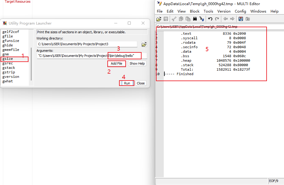 (2)、然后,在打開的Utilities Program Launcher窗口中的命令列表中選擇gsize命令。然后點擊Add FIle去找到工程bindebug目錄下的ELF文件(目錄下沒有文件擴(kuò)展名的文件)。選擇完畢后去運(yùn)行。然后就出現(xiàn)對應(yīng)的內(nèi)存大小。(如圖4-2-2)