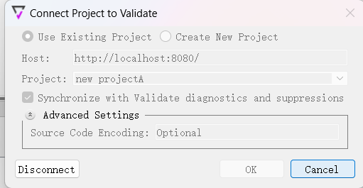 5、在彈出的Connect Project to Validate窗口選擇Use Existing Project,Project輸入項目名,勾選同步,點擊“Connect”;