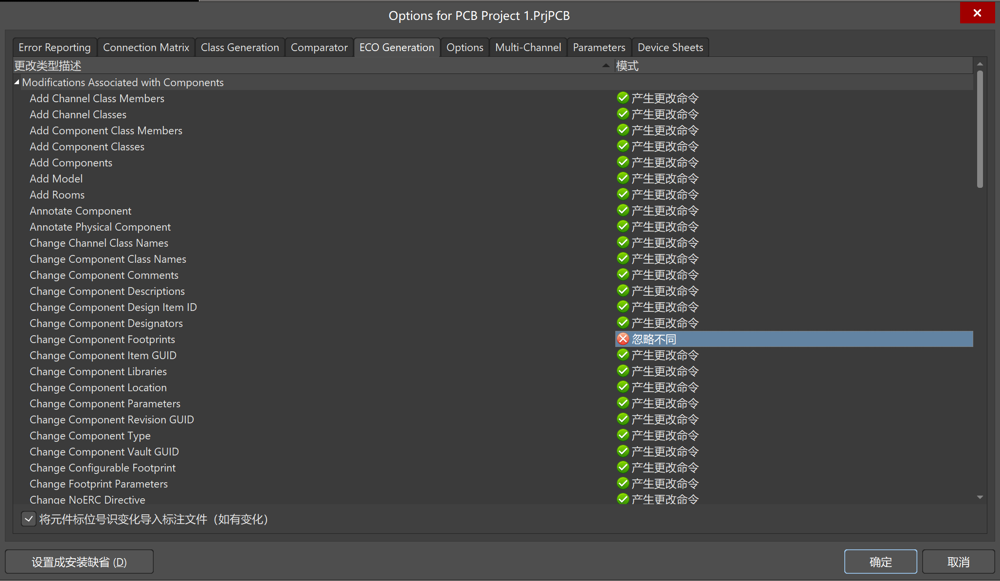1)打開(kāi)Project Options,進(jìn)入ECO Generation,找到Change Component Footprint,看一下模式一欄是否設(shè)置為“忽略不同”,此模式下,封裝的變更會(huì)被忽略。將模式設(shè)置為“產(chǎn)生更改命令”。