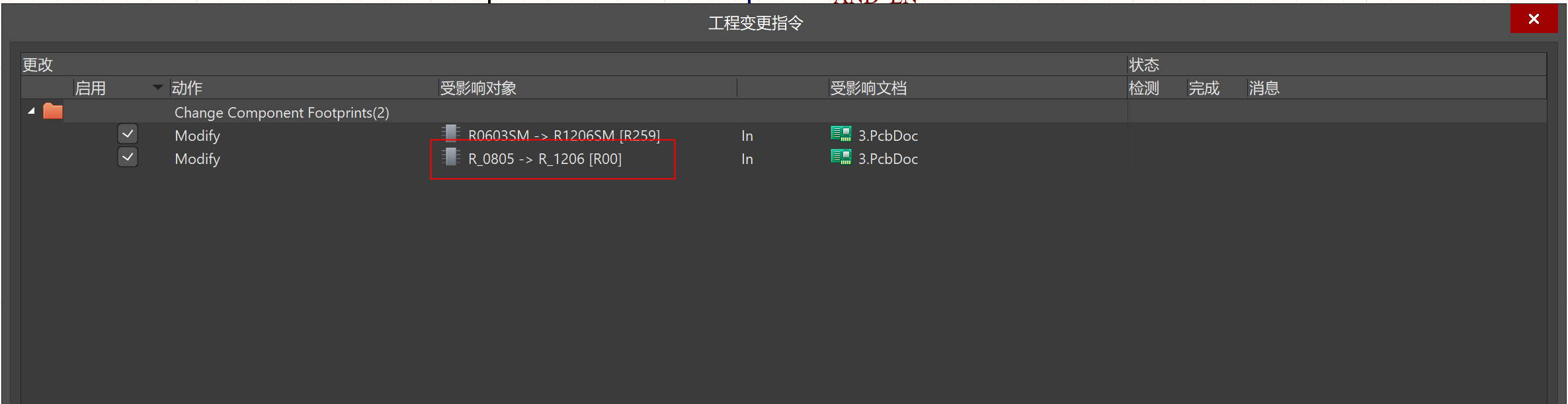 2)執(zhí)行update PCB,就會(huì)出現(xiàn)封裝變更的信息