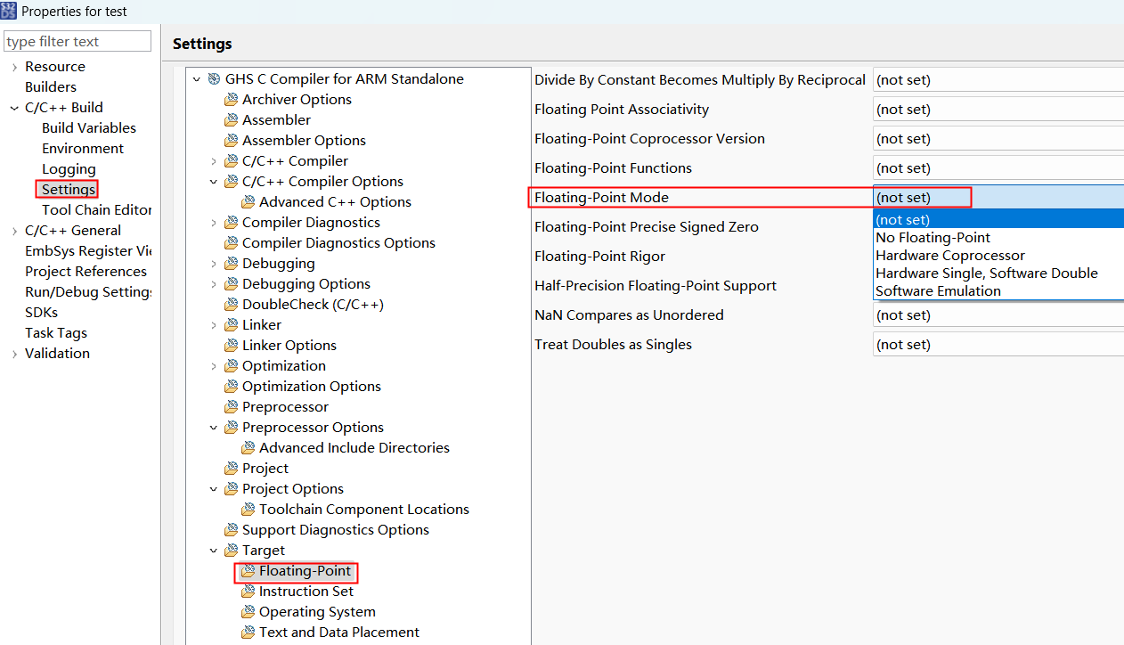 2)、進(jìn)入“Properties for test”,選擇“C/C++Build” -->"Settings"-->"Target"-->"Floating-Point",在<Floating-Point Mode>框內(nèi),選擇相應(yīng)的浮點(diǎn)模式進(jìn)行使用。