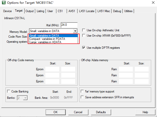 (3)、“Large : variables in XDATA:”:在Large模型中,默認情況下,所有變量都駐留在外部數(shù)據(jù)內存中(最高可達64K字節(jié))。這與使用xdata內存類型說明符顯式聲明它們是一樣的。數(shù)據(jù)指針(DPTR)用于外部內存尋址。需要注意的是,通過數(shù)據(jù)指針訪問內存的效率很低,而且速度很慢,特別是對于兩個或兩個以上字節(jié)長的變量。這種類型的數(shù)據(jù)訪問機制比small model或compact model生成更多的代碼。
