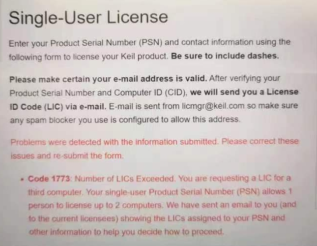 在安裝LIC時(shí),在Keil單用戶許可證頁面上單擊Submit后出現(xiàn)錯(cuò)誤:Code 1773 Number of LICs for this PSN Exceeded.