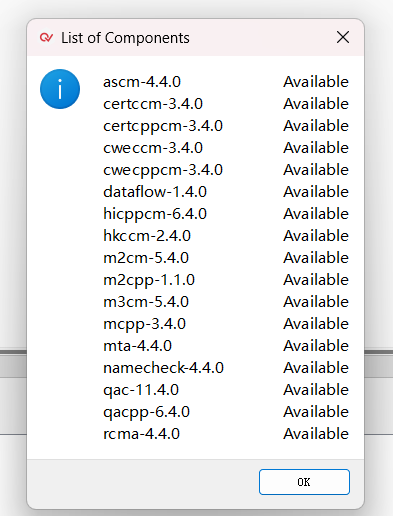 4.點(diǎn)擊“OK”,保存后關(guān)閉窗口彈出List of Components窗口,各組件狀態(tài)為Available,即連上license管理器成功。
