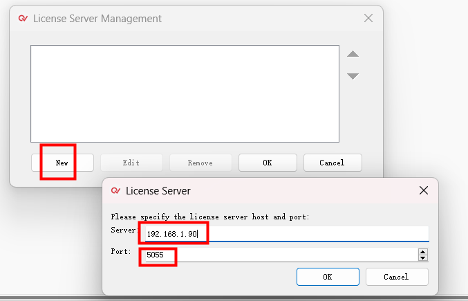 3、在License Server Management窗口中點(diǎn)擊“New”,彈出Licesne Server窗口,server中輸入rlm所在機(jī)器的ip,端口默認(rèn)5055;