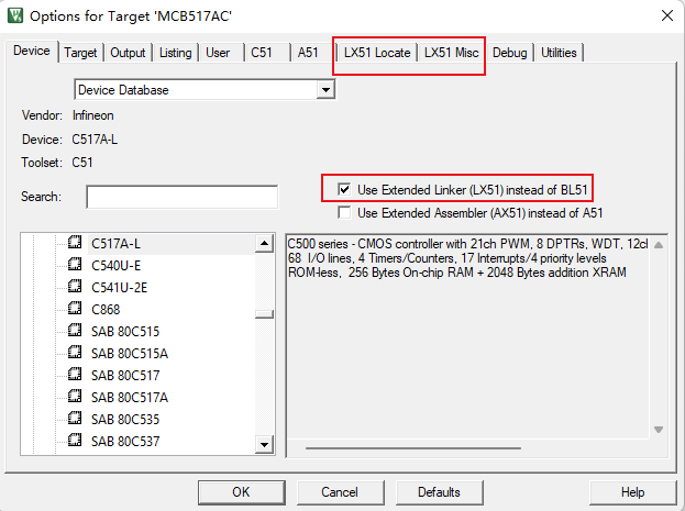 1)、在Options->Device窗口中,可以找到“Use Extended Linker (LX51) instead of BL51”的勾選項。選擇后,鏈接器的使用選項就會變成LX51(如圖4-1)。