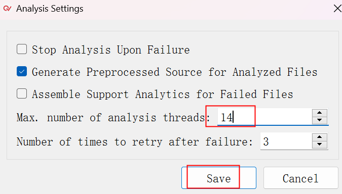 2、在Analysis Setting中number of analysis threads設置用于分析的線程數,點擊“Save”保存設置,關閉窗口,即可多線程分析代碼。