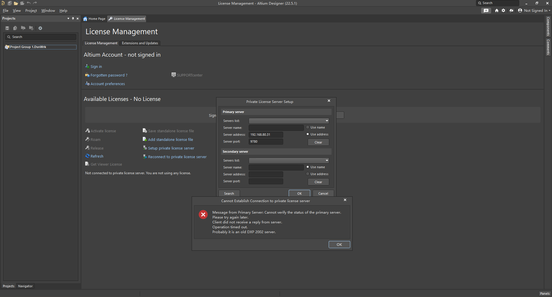 客戶AD軟件連接服務器獲取授權,出現“災難性故障”報錯(如圖1),重啟和重置軟件還是沒辦法解決,然后卸掉軟件刪除注冊表重裝軟件又出現以下報錯:Message from Primary Server: Cannot verify the status of the primary server.