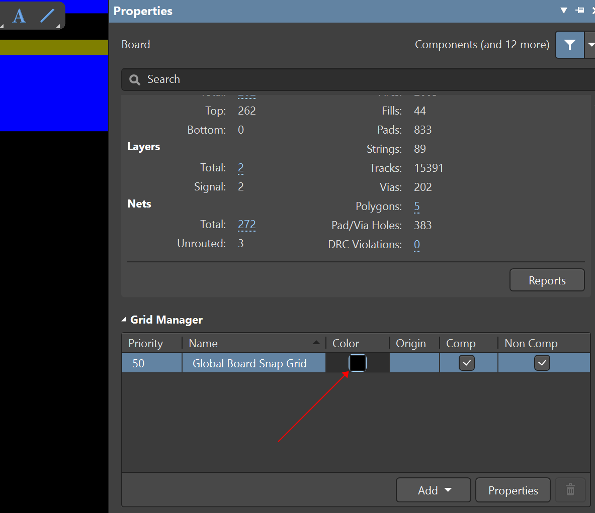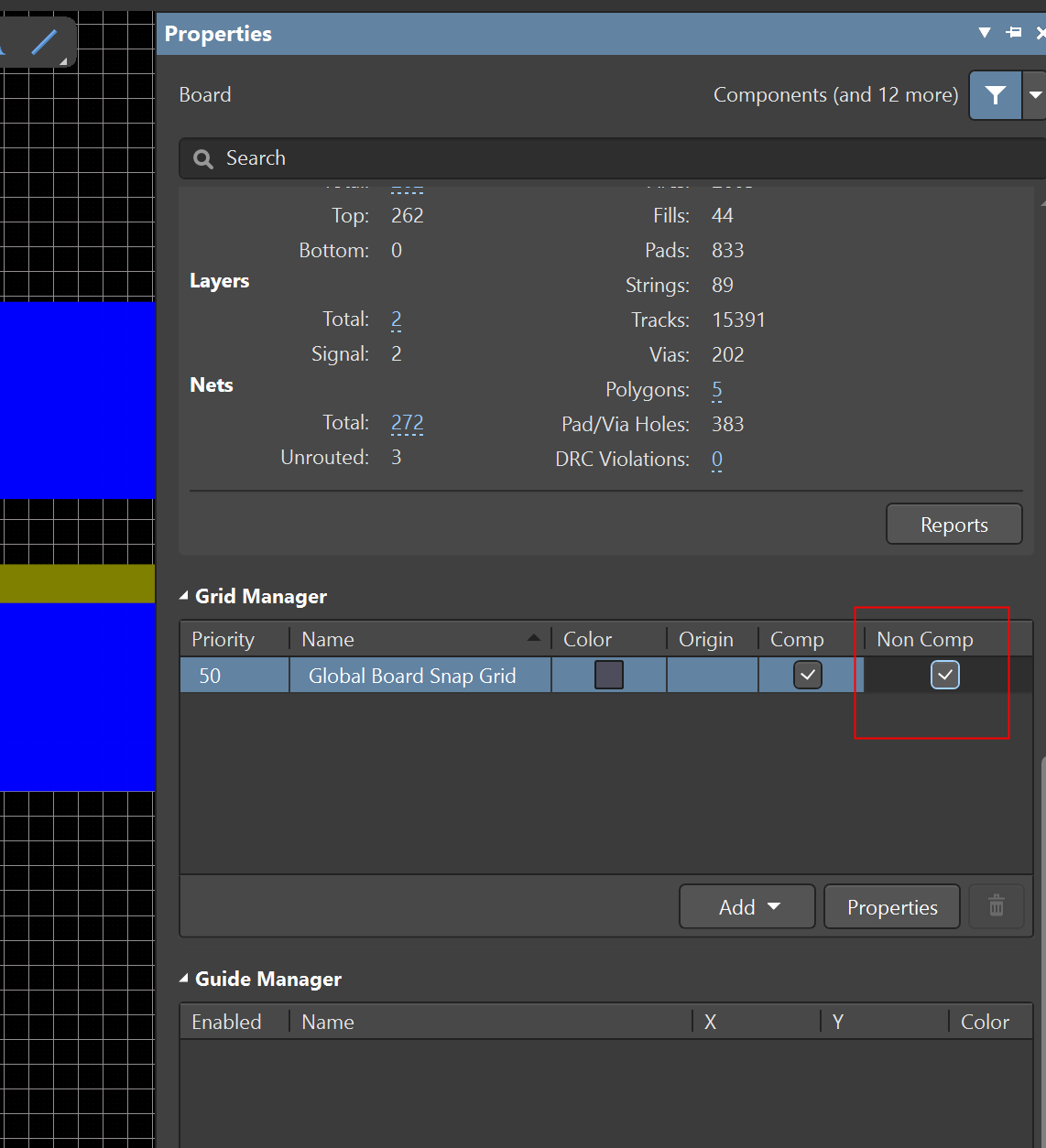 3)、在Board屬性中找到Grid Manager,查看"Non Comp"是否打勾,打勾顯示柵格,取消打勾不顯示柵格,如圖3。此處設(shè)置直接受1、2兩處影響,當(dāng)1、2兩處設(shè)置為不顯示,在此處勾選了也不會顯示柵格。