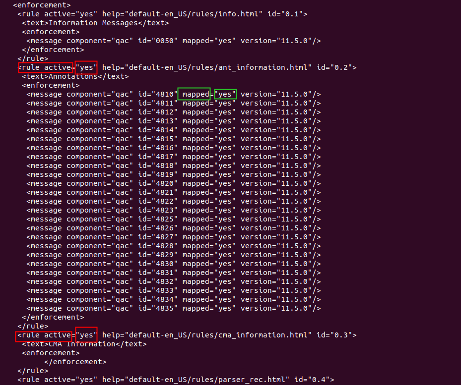 規(guī)則級:我們可以看到該文件內(nèi)rule active狀態(tài)為"yes",將修改成“no”,下方的message 4810-4835均會被抑制,靜態(tài)分析時并不會分析下列消息。