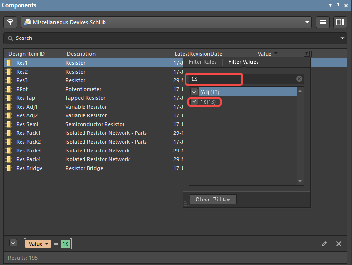 5. 在搜索框中輸入 1K,勾選 1K,這時候就會顯示所有值為 1K 的器件;