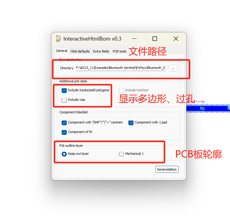 3、這里就可以設置文檔輸出的路徑,輸出的模型圖包含多邊形和過孔,以及選擇輸出的PCB的輪廓層,后面的幾個設置都是可以在網頁中直接調整,不在這里介紹。得注意的是,這里的BOM輸出并沒有設置表頭這類信息的調整。
