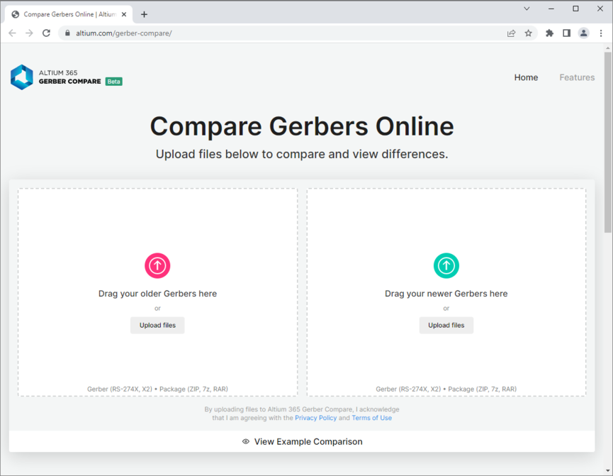 打開瀏覽器,訪問 Altium 365 Gerber Compare在線工具。該工具提供了強大的 Gerber 文件對比功能,支持多種設計工具生成的 Gerber 文件,包括 Altium Designer、KiCad、Eagle 等。