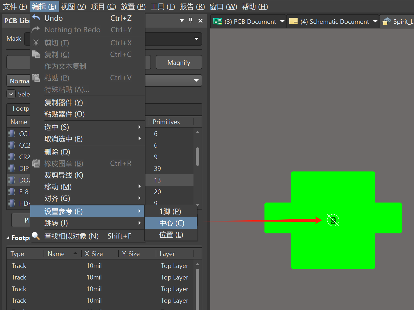 2)、在封裝編輯器里點擊【編輯】->【設置參考】->【中心】,把參考點設置為中心,如圖3,然后把鏡像過的器件在PCB里面刪除,在原理圖里重新導入封裝,重新更新原理圖到PCB里,導入仿真軟件里就不會出現封裝偏移的情況。