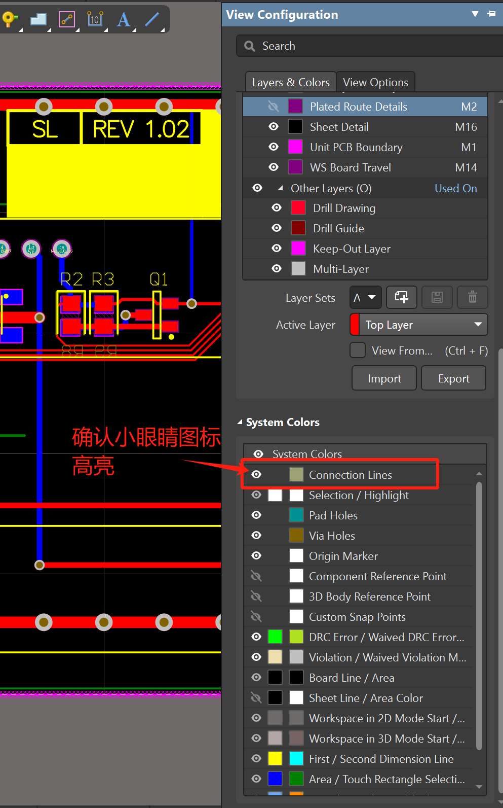 2)、如果上面步驟操作完還是不顯示,在PCB編輯界面右下角打開"Panles"->"View Configuration",看看是否關(guān)閉了連接線的顯示,把system Colors模塊下的Connectoin Lines(連接線)左邊的小眼睛圖標(biāo)取消勾選;