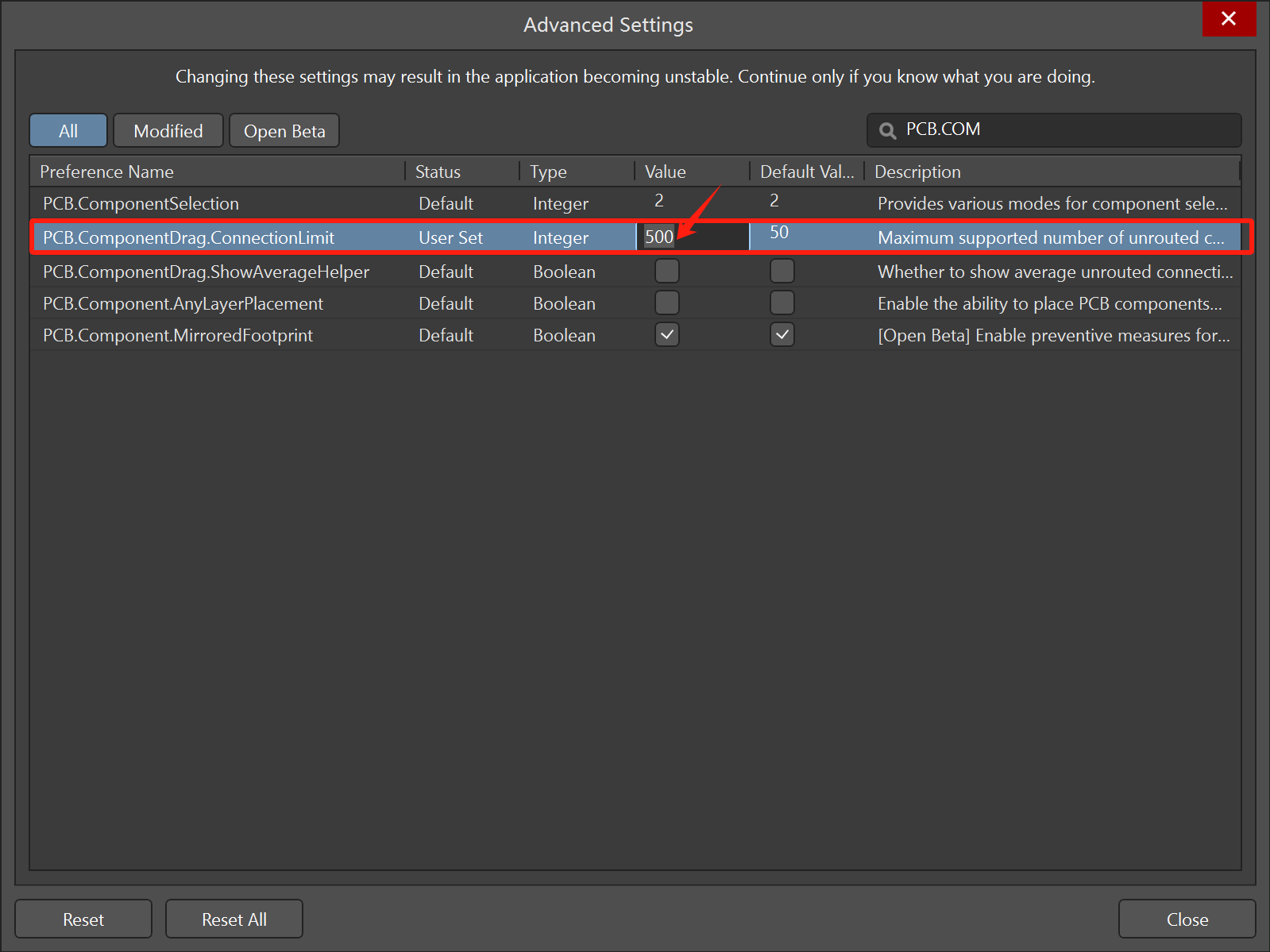 Preferences(右上角的齒輪圖標(biāo))->System -> General -> Advanced button->搜索 PCB.ComponentDrag.ConnectionLimit ->將值增加到500。