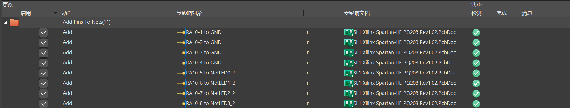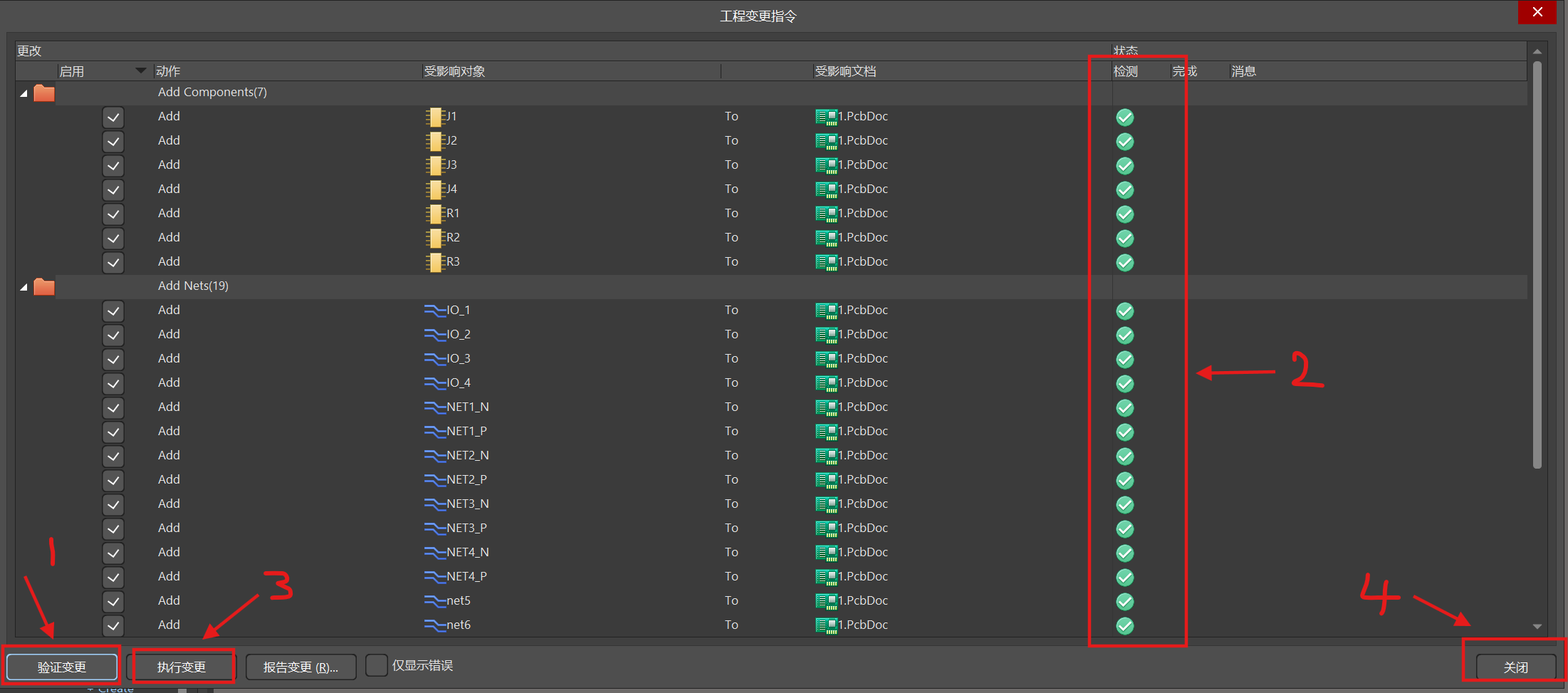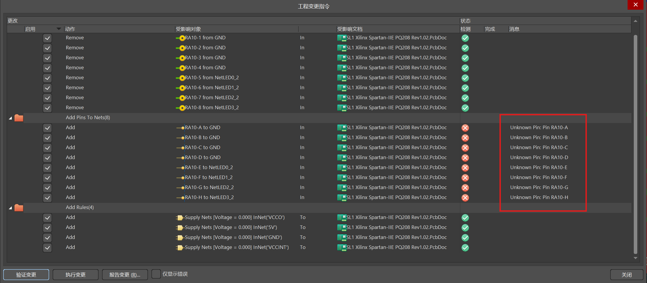 (3)在彈出的對話框點擊驗證變更,就會看到沒有"Unknown Pin"的報錯,此時再點擊執(zhí)行變更命令,就可以將原理圖導入到PCB中,最后點擊關閉就可以,操作如圖11。