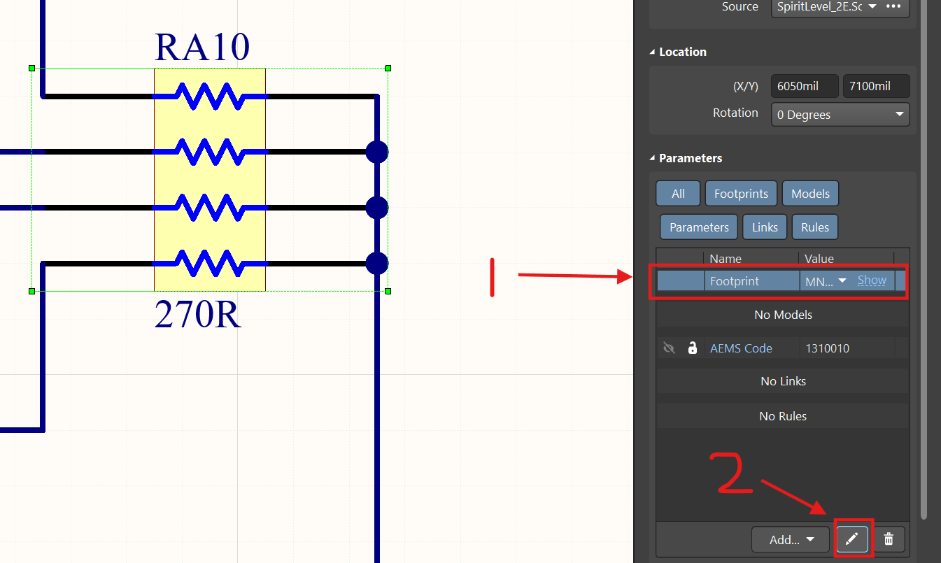 1、雙擊元件打開屬性面板框,點擊Footprint然后點擊編輯,查看封裝是否匹配,操作如圖2。