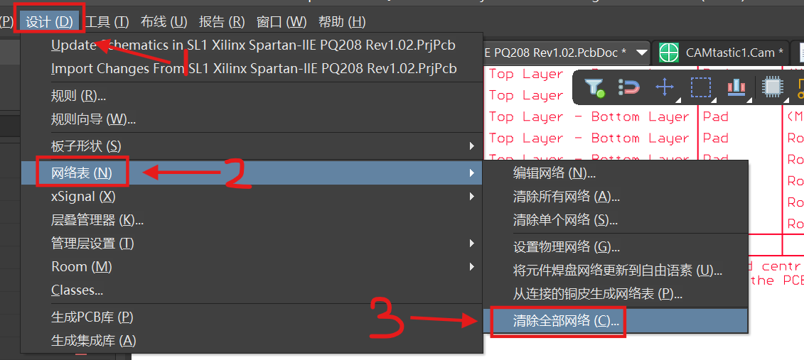 2、若不想新建PCB,重新導入需將PCB中的網絡全部刪除,重新導入,操作步驟如下: