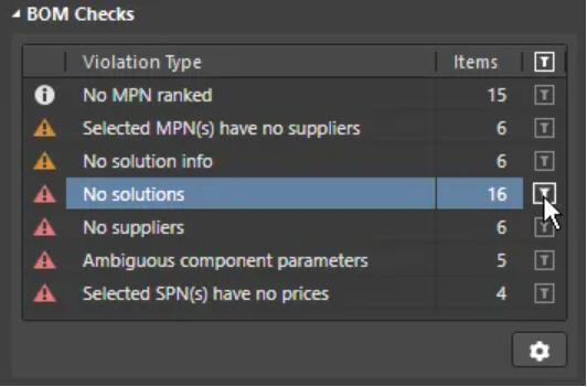 檢查每個BOM條目是否存在違規,檢查其狀態是否顯示在BOM Status列中。本列在BOM條目列表右側始終可見,并顯示表面該條目狀態的圖標。請注意,如果條目在多次BOM檢查中失敗,圖標顯示最嚴重的故障。