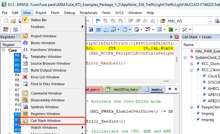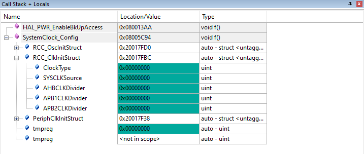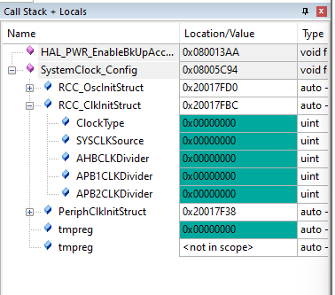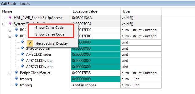 1)、在MDK Debug模式下,有一個(gè)Call Stack + Locals窗口,該窗口就是用于顯示當(dāng)前位于堆棧上的對(duì)象。對(duì)于使用RTX-RTOS的應(yīng)用程序,會(huì)顯示任務(wù)。每個(gè)對(duì)象都與其位置或值以及類型相關(guān)聯(lián)。當(dāng)前函數(shù)位于列表頂部,被調(diào)用函數(shù)位于其下方,并且還會(huì)顯示當(dāng)前函數(shù)的所有局部變量的信息。(如圖4-1)