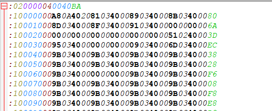(1)“:”:表示開頭,每一行數(shù)據(jù)都會用冒號進(jìn)行開頭,表示一個新的內(nèi)存地址數(shù)據(jù)開頭