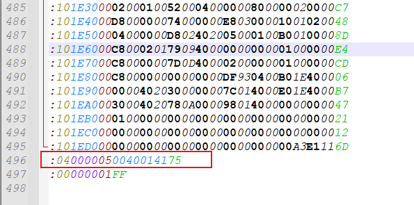 (3)、Hex文件的倒數(shù)第二行數(shù)據(jù)(如圖4-3-3-2):“:040000050040014175”