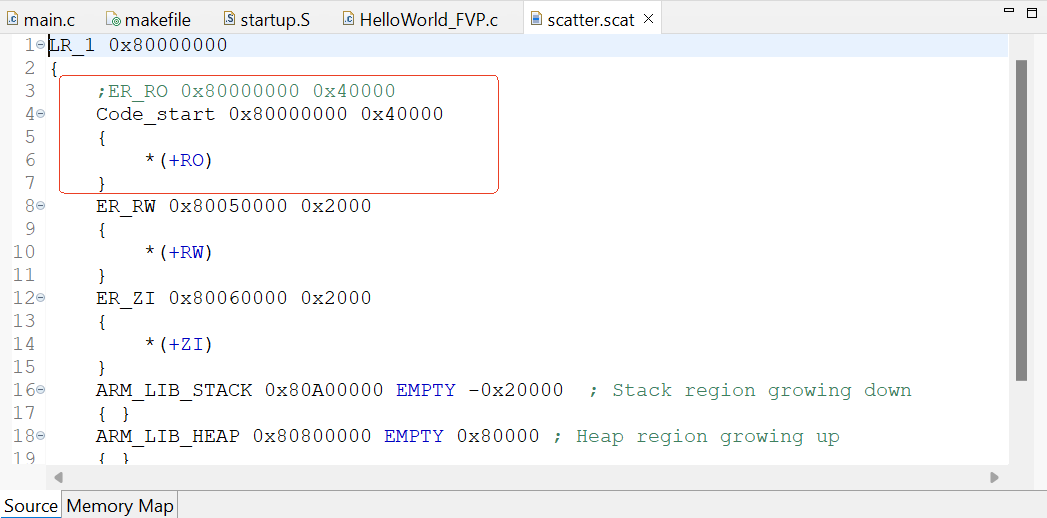在ArmDS中,在鏈接腳本(Scatter文件)中定義一些變量,然后在C文件中引用。例如在鏈接腳本中定義這個(gè)變量code_start ; 然后在C語言函數(shù)中extern 這個(gè)變量。