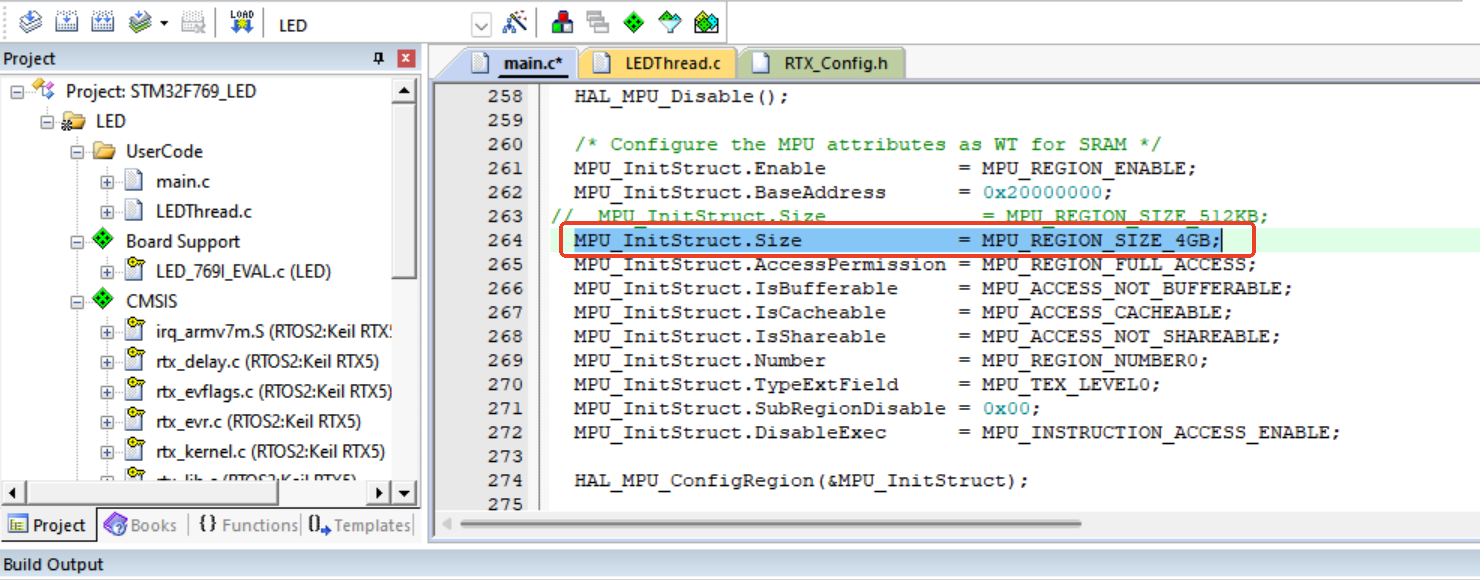 注:當MPU的區域大小設置為MPU_REGION_SIZE_4GB時,它覆蓋了一個非常大的內存區域,這通常包括了整個地址空間,因此不太可能限制到RTX線程所需的特定內存區域。而當設置為MPU_REGION_SIZE_512KB時,覆蓋的內存區域較小,如果這個區域沒有正確覆蓋RTX線程的棧空間或需要訪問的內存區域,就可能導致線程無法正常啟動。