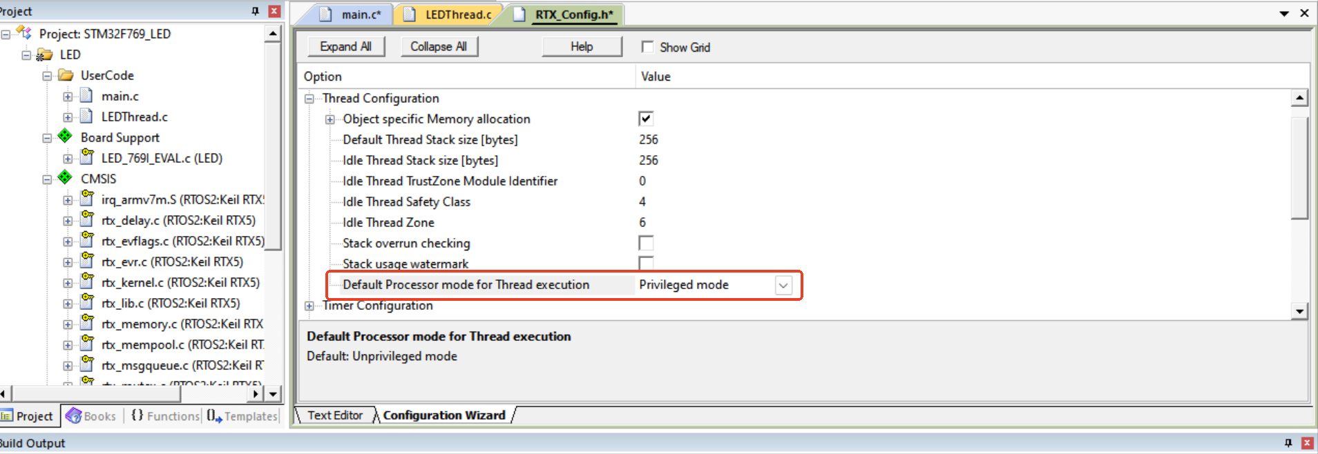 如果不修改“MPU_InitStruct.Size”的值,打開RTX的配置文件把默認線程的模式修改為特權模式,如圖4-2所示: