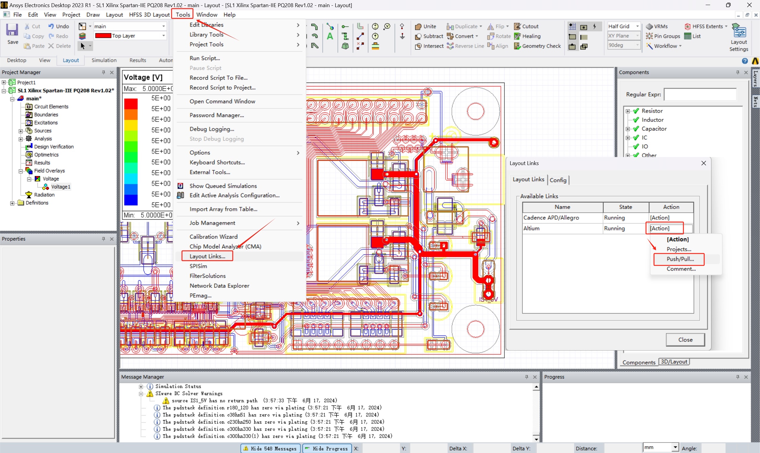 仿真工程師做好仿真工作后,導(dǎo)航至菜單欄的【Tools】選項,繼而選取【Layout Links】以啟動該功能的對話框。在對話框內(nèi),通過依次選擇 Altium 的【Action】菜單并點選【Push/Pull】