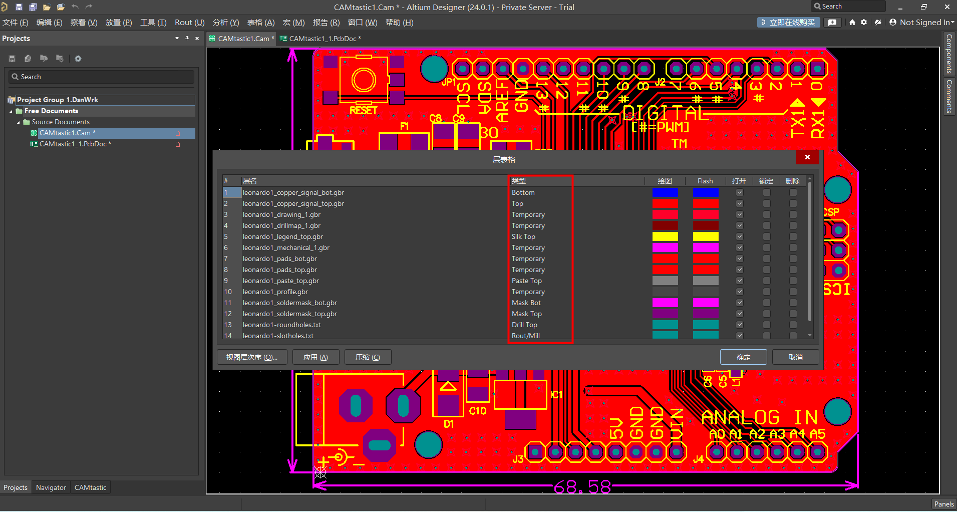 左側的 Gerber 層必須和 Type 列中的 PCB 層正確映射。其中信號層的映射尤其重要:頂層/底層分別映射為Top/Bottom;中間信號層映射為 Internal;內電層映射為 Pos Plane/Neg Plane。除此之外,NC Drill 文件也需要正確映射到 Drill 層。