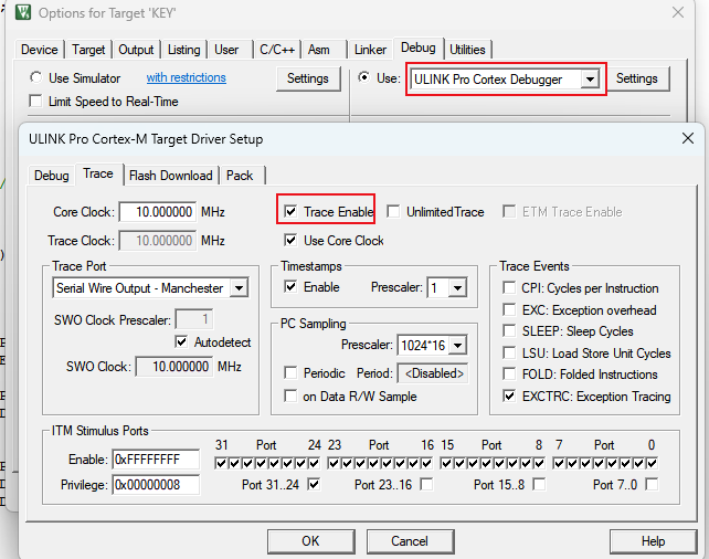 注意:Logic Analyzer功能在這里使用的SW接口進(jìn)行調(diào)試,非ETM接口。Logic Analyzer功能使能Trace的時(shí)候勾選Trace Enable選項(xiàng)即可,和性能分析、代碼覆蓋率不一樣,不需要芯片具備Trace數(shù)據(jù)端口。