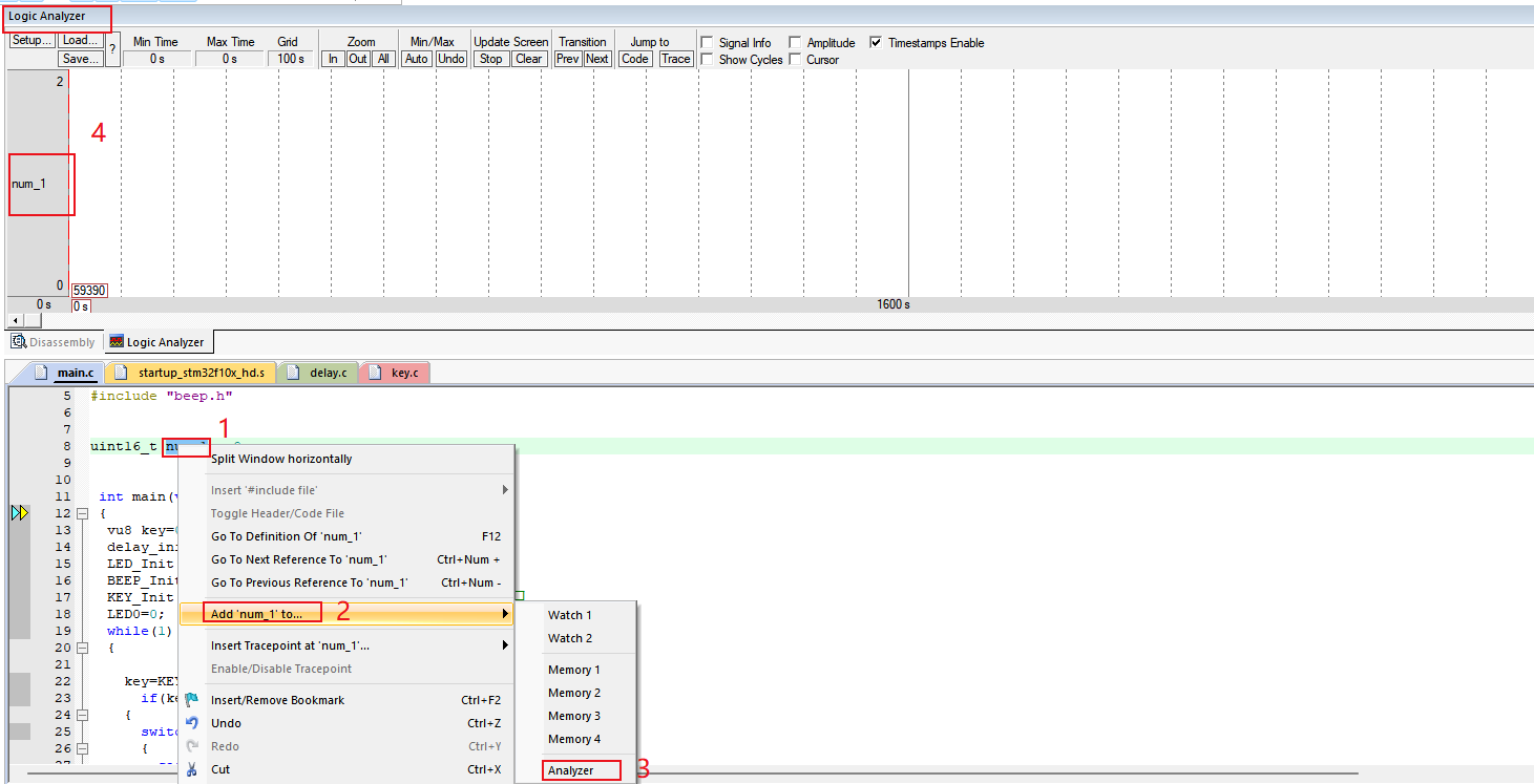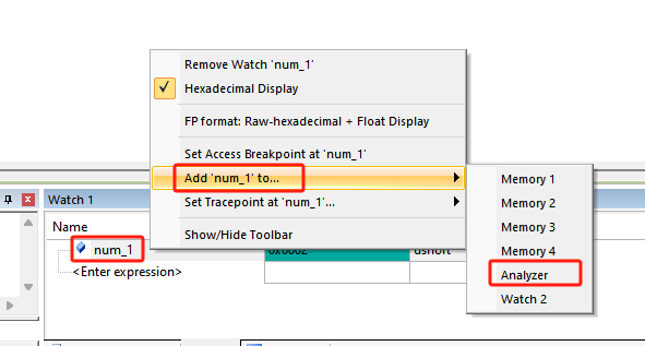 2. 想要將變量添加到Logic Analyzer窗口中,可以在代碼中直接選中對(duì)應(yīng)的變量,然后,右鍵選擇Add ‘xxx’ to ...->Analyzer。然后,我們就可以在Logic Analyzer窗口中看到變量被添加到進(jìn)去了(如圖2-4)?;蛘咭部梢酝ㄟ^(guò)watch窗口中去添加(如圖2-5)。