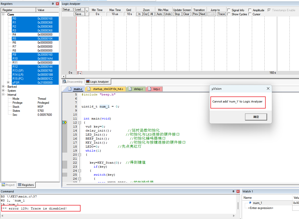3. 如果在前面的步驟中沒(méi)有使能Trace功能的話,在添加變量到Logic Analyzer窗口時(shí)候就會(huì)提示“Cannot Add ‘xxx’ to Logic Analyzer”,并且在Command窗口中會(huì)提示“*** error 129: Trace is disabled!”(如圖2-6)。