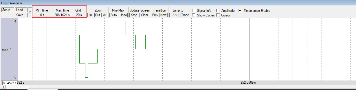 a) Min Time:設(shè)置顯示的信號(hào)記錄緩沖區(qū)中的第一個(gè)時(shí)間戳。當(dāng)μVision記錄信號(hào)時(shí),時(shí)間從零開(kāi)始,并不斷向前滾動(dòng)。